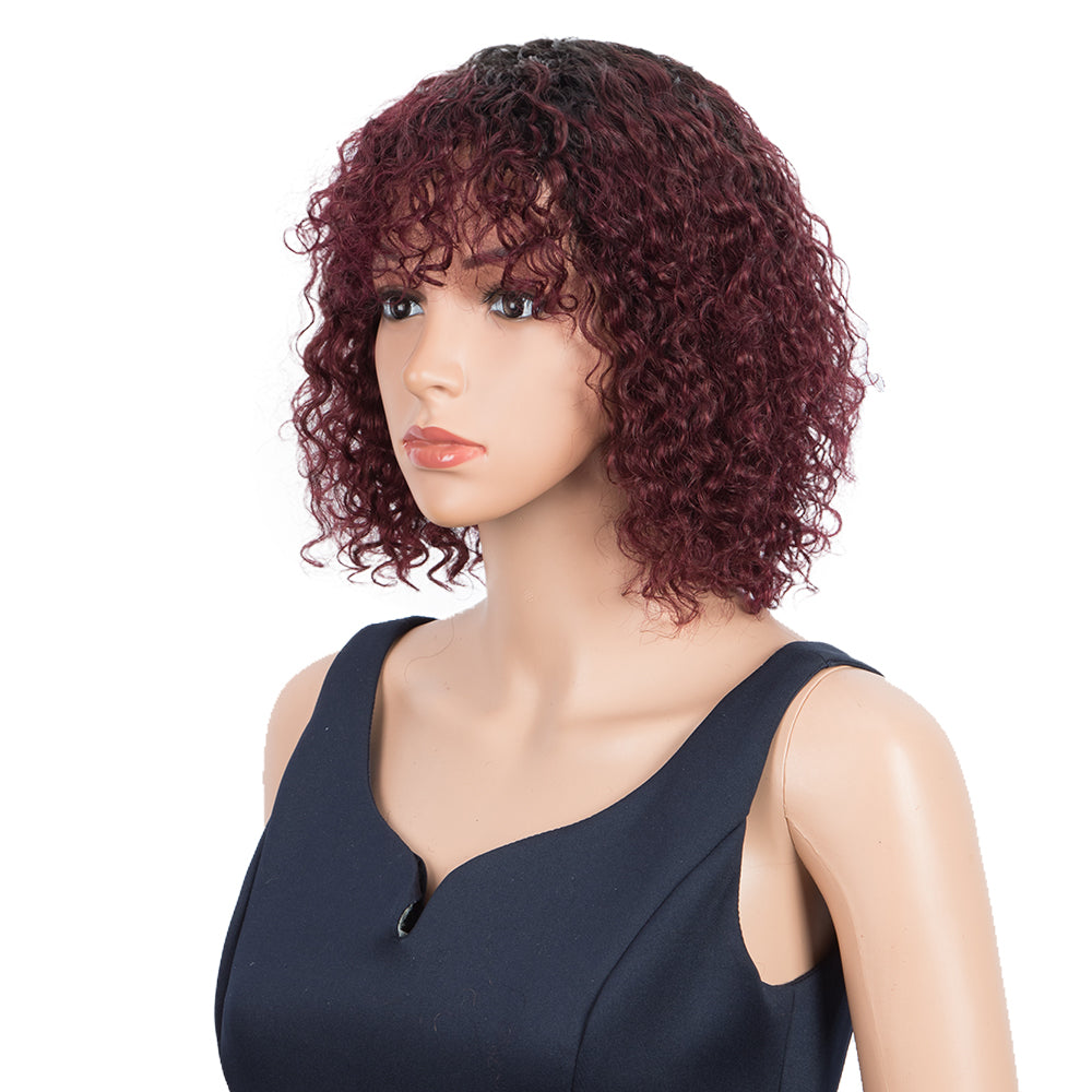 Rebecca Fashion Short Curly Wigs with Bangs Kinky Curly Wigs for Black Women 14 Inch Remy Ombre Wine Red Wig